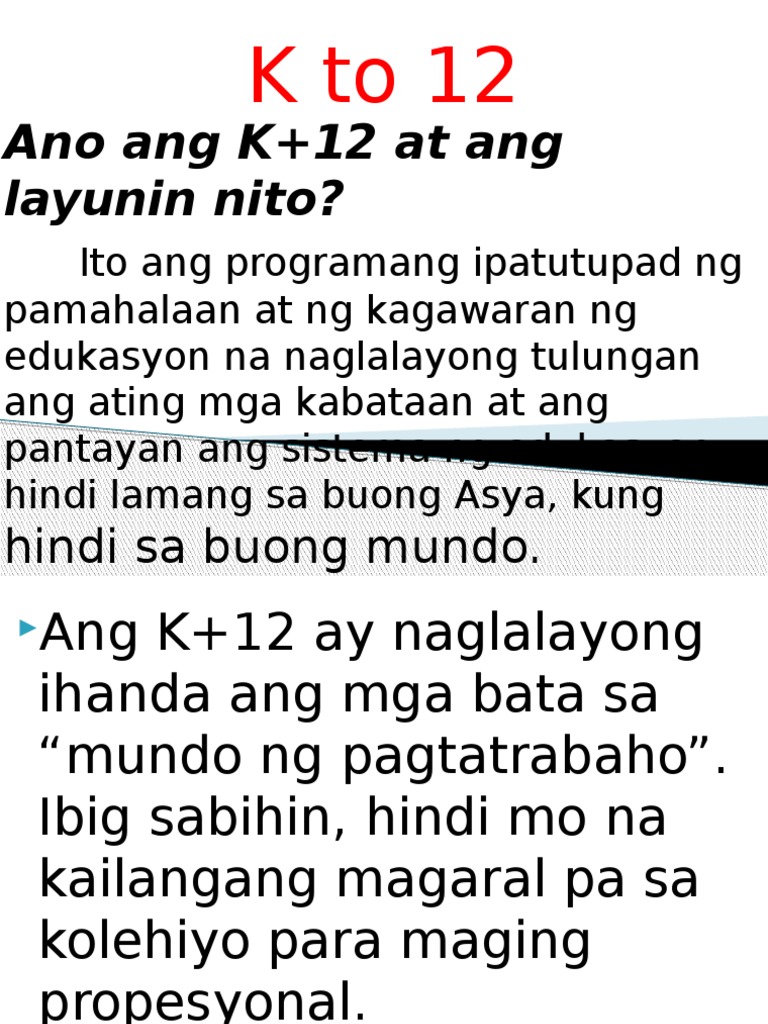 Ito ang programang ipatutupad ng pamahalaa at ng. K-12 Basic Education Program Batang K-12 Handa sa Trabaho o Kolehiyo Handa sa Mundo 2. Simula 2012 in-implement na ng mga paaralan ang.