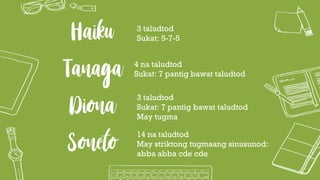 Download as PPTX PDF TXT or read online from Scribd. 19022013 Hinggil sa Malikhaing Pagsulat ng Tula sa Filipino. Pagsulat ng Tula Habi ng Salita.