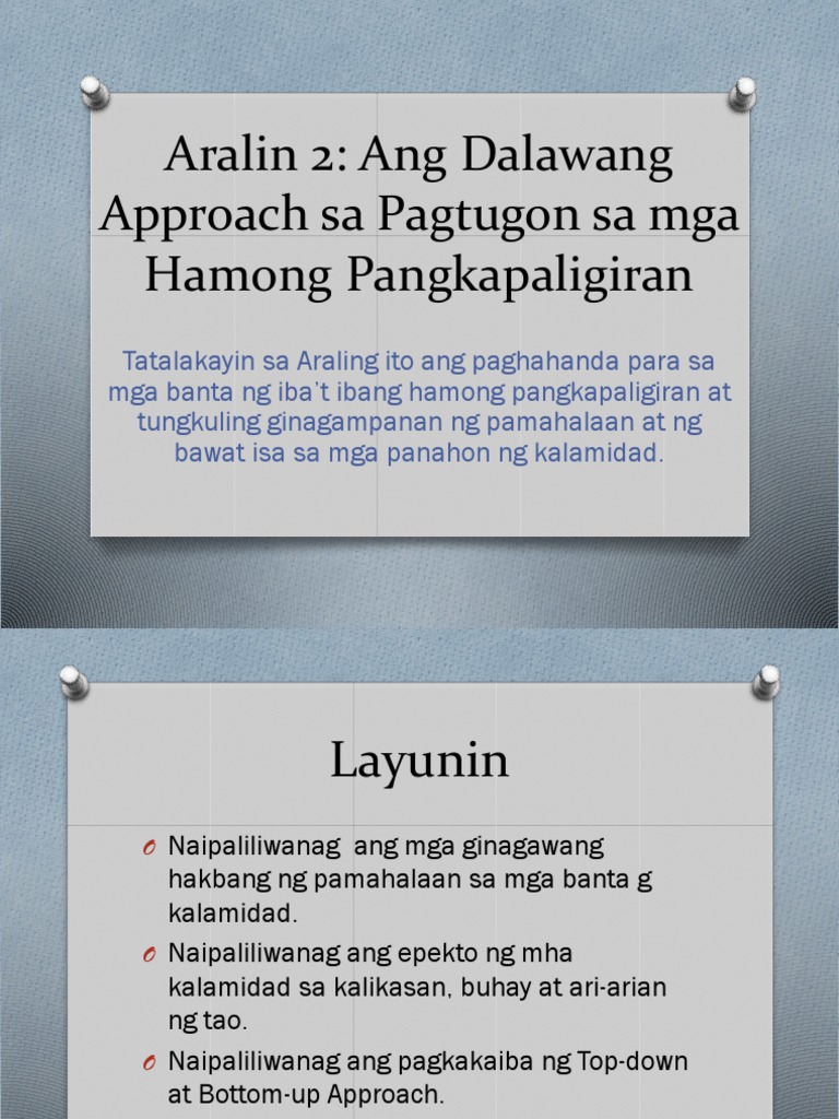 Bottom-up Approach-kung saan ay nagsisimula sa mga mamamayan at iba pang sektor ng lipunan ang mga hakbang sa pagtukoy pag-aanalisa at paglutas sa mga suliranin at hamong pangkapaligiran na nararanasan sa kanilang pamayanan-ang konsepto nito ay ginagamit sa CBDRM-binibigyang pansin dito. Ang Community Based Disaster Risk Management o CBDRM ay isang mahalagang bagay na dapat bigyan ng pokus ng. Dalawang Approach sa Pagtugon sa mga Hamong Pangkapaligiran 1.