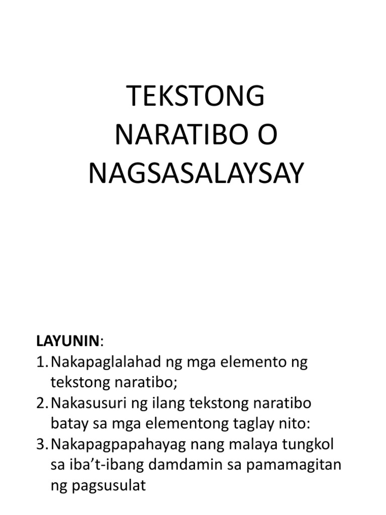 3May matibay na mga bahagi simula gitna wakas. Nagagamit ang cohesive device sa pagsulat ng halimbawang teksto Panimula Ang bawat babasahin o sulatin ay. LAYUNIN NG TEKSTONG NARATIBO.